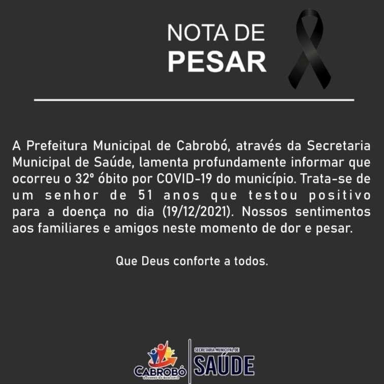 O município de Cabrobó, no Sertão de PE, registrou nesta quarta-feira (29), mais uma morte vítima do Coronavirus. Agora o número de óbitos aumenta para 32 casos desde início da pandemia. A última morte por Covid-19, ocorreu no último dia 12 deste mês.