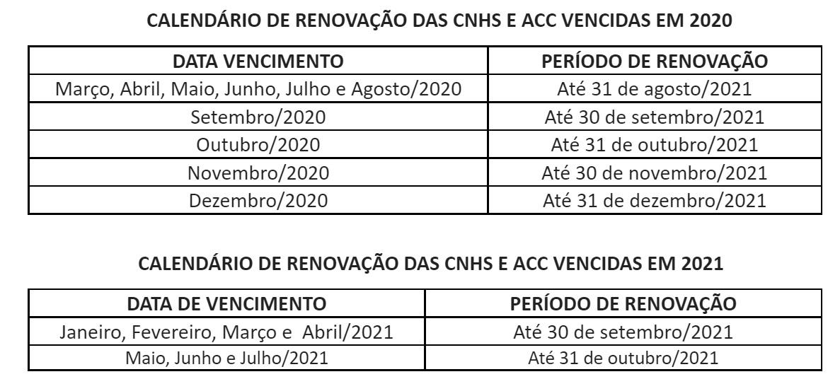 Com a nova medida, a apresentação de defesa prévia e indicação de condutor infrator, suspensa desde 16 de março de 2020, fica encerrada em 31 de julho de 2021, para as notificações expedidas. Também estão incluídas as notificações que não foram expedidas de 16 de março/20 a 31 de agosto/21, que serão emitidas a partir de 1º de setembro/21 seguindo os prazos legais expressos nas notificações. A nova medida servirá ainda, para apresentação de recursos em processos de suspensão do direito de dirigir e cassação da CNH, a partir de 4 de agosto/21. A renovação de CNHs e as Autorizações para Conduzir Ciclomotor (ACC), vencidas em 1º março/20 e com vencimento até 03 de agosto/21, também estão contempladas na medida.