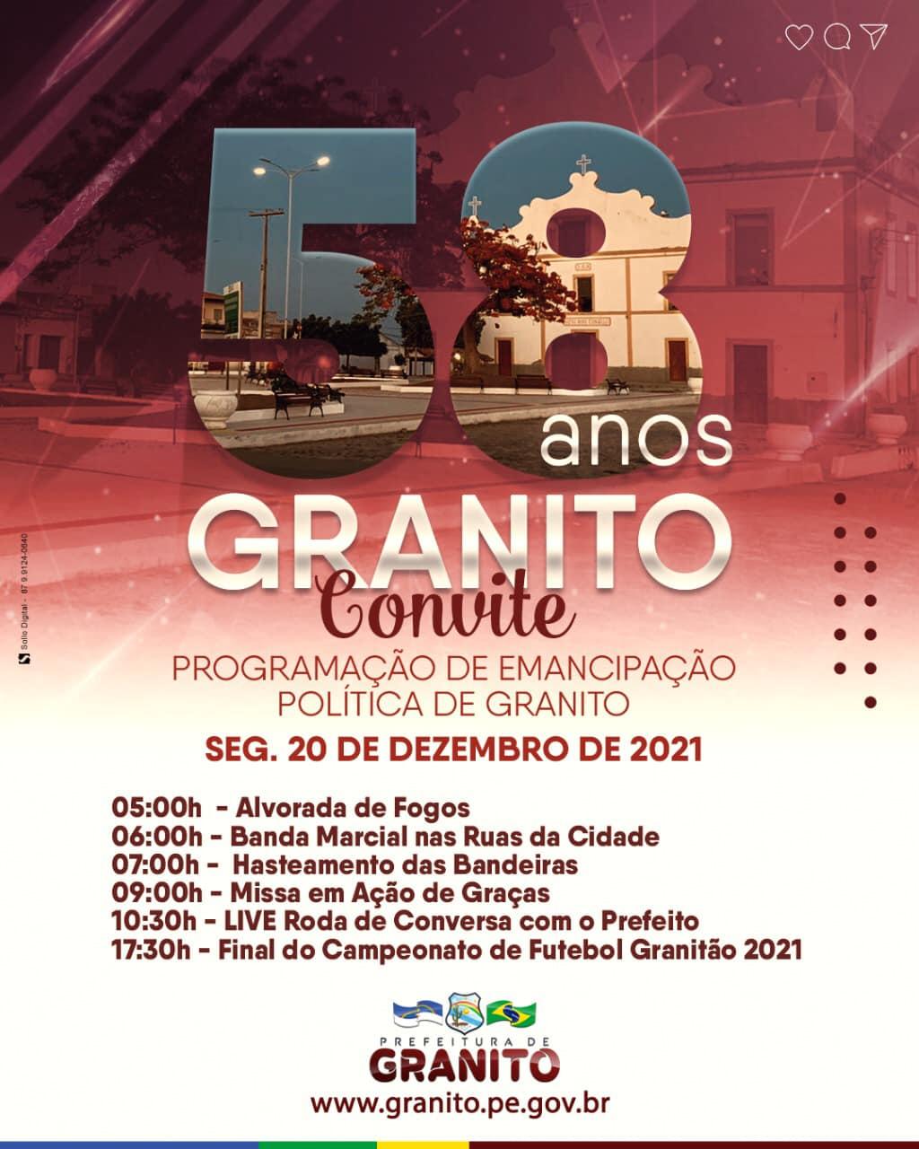 Na próxima segunda-feira (20), o município de Granito, no Sertão de PE, celebra 58 anos de emancipação política. A Prefeitura Municipal preparou uma programação para comemorar o aniversário da cidade.