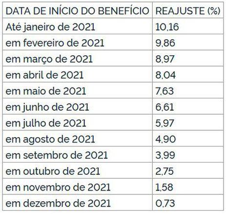 As quantias pagas aos segurados da Previdência que ganham acima de um salário mínimo foram reajustadas em 10,16%, com exceção de quem começou a receber seu benefício a partir de fevereiro de 2021. Para esses, aplica-se um fator de reajuste que leva em conta a data de início da aposentadoria ou pensão (ver tabela abaixo).