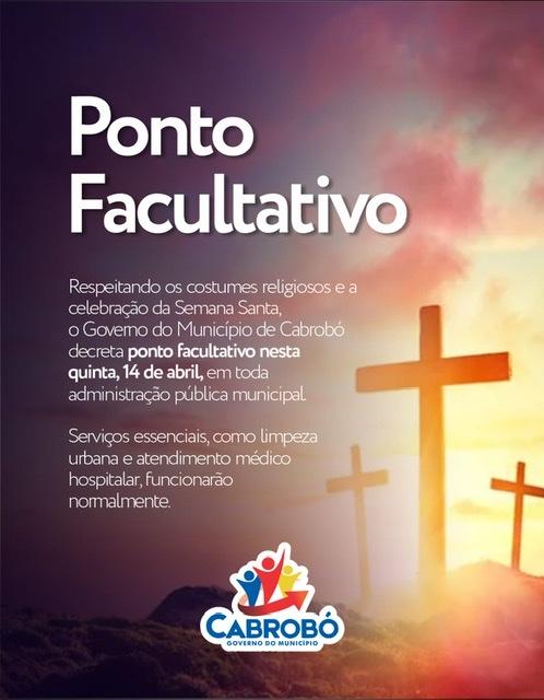 Considerando que o dia 15 de abril ocorre a Paixão de Cristo, sendo feriado nacional, o Prefeito de Cabrobó, no Sertão de PE, Galego de Nanai, publicou na segunda-feira (11), o Decreto Nº 028/2022, que estabelece Ponto Facultativo na quinta-feira (14).