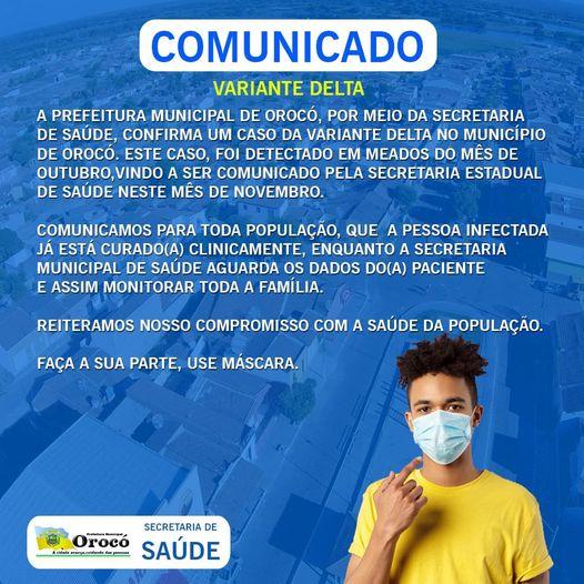 A Prefeitura de Orocó, no Sertão de PE, através da Secretaria Municipal de Saúde, emitiu nesta segunda-feira (22), um comunicado sobre um caso da variante Delta no município. O caso foi confirmado e publicado pela Secretaria Estadual de Saúde de Pernambuco na última quinta-feira (18).