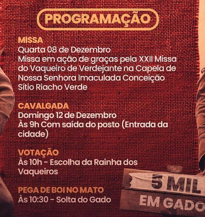 A Secretaria Municipal de Educação por meio da Diretoria de Cultura está preparando o evento com muito capricho. As comemoração da XXII Missa do Vaqueiro irá contar ainda com a escolha da rainha dos vaqueiros que desfilarão na cavalgada.